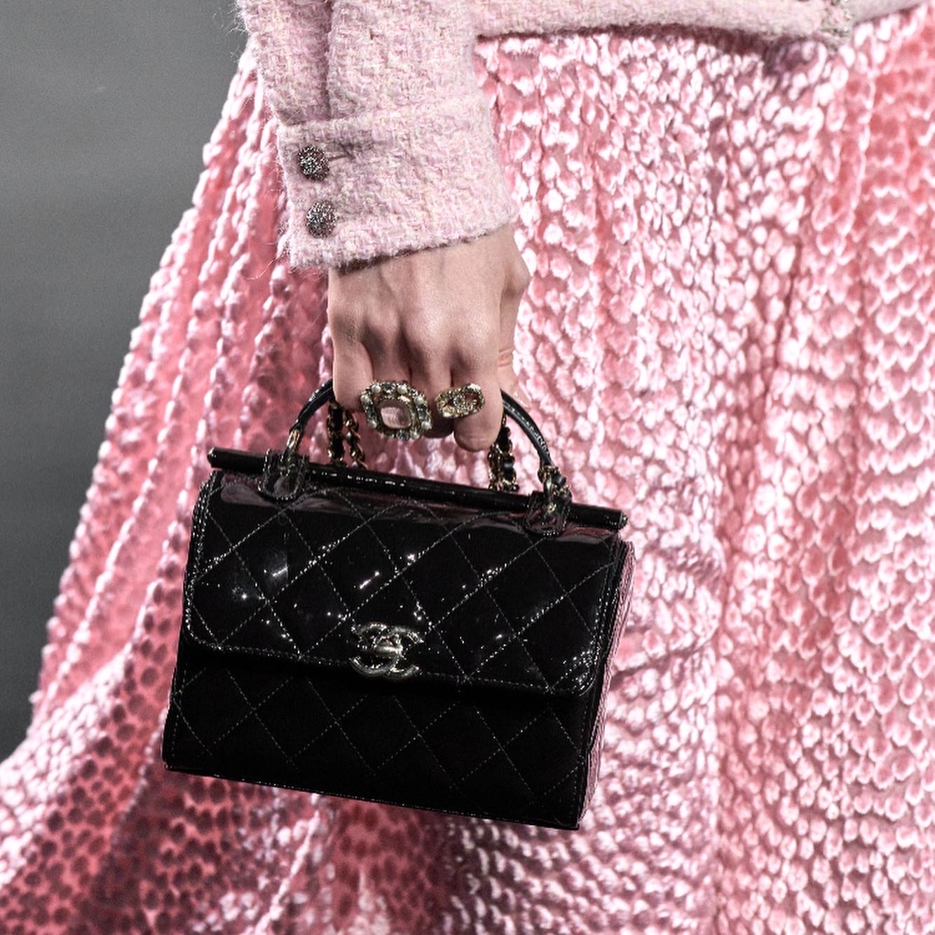 The classical mix of soft pink and black never get off, on this occasion Chanel and Giorgio Armani take inspiration by mixing the textures like velvet (pink) and the timeless black charol.